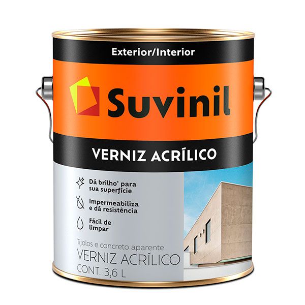 Suvinil Verniz Acrílico dá acabamento brilhante e transparente às paredes. Impermeabiliza diferentes superfícies como tijolos, concreto aparente, fibrocimento e pinturas.